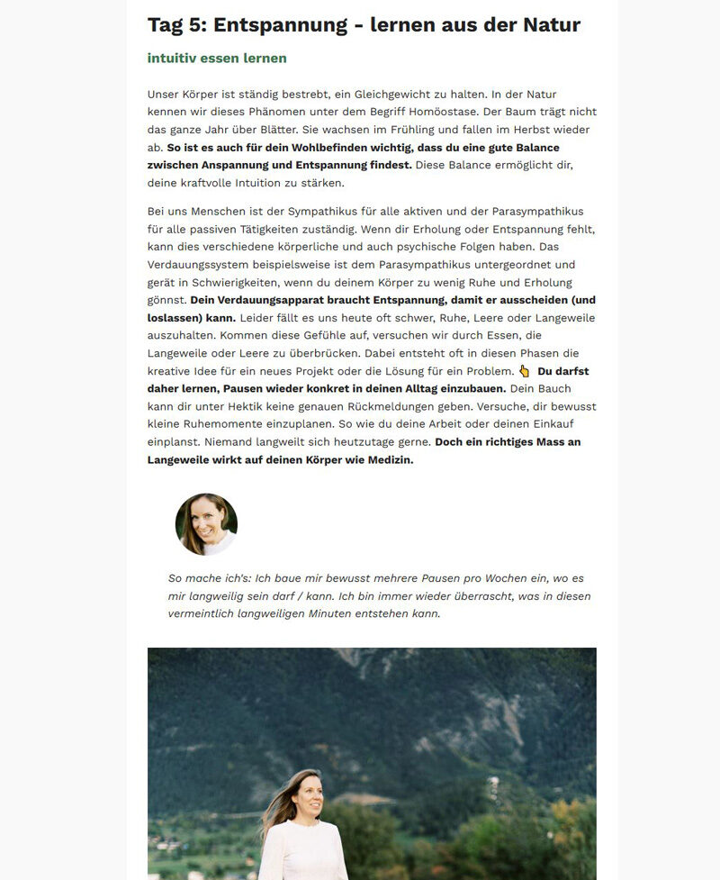 Der Kurs «intuitiv essen lernen» war für mich eine sehr lehrreiche Erfahrung. Jeden Tag erhielt ich einen neuen spannenden Input zum täglichen Thema und eine praktische Übung, die ich gut in den Alltag integrieren konnte. Durch die tägliche Abwechslung und die spannenden Inhalte nahm ich mir jeden Tag gerne die nötige Zeit für das Programm. Ich kann diesen Kurs nur weiterempfehlen!